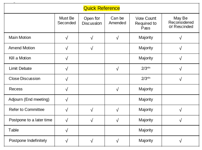 - Move to table the motion. The motion may be taken from the table after 1 item of business has been conducted. If the motion is not taken from the table by the end of the next meeting, it is dead. To kill a motion at the time it is tabled requires a 2/3 rds vote. A majority is required to table a motion without killing it.